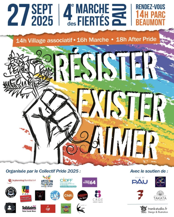 c’est le mot d’ordre de cette 4ème édition… « À l’image de ce que représente une Marche des Fiertés : une manifestation politique pour résister, un cortège haut en couleur pour exister, avec une seule fin : s’aimer simplement » expliquent les membres du Collectif Pride de Pau.